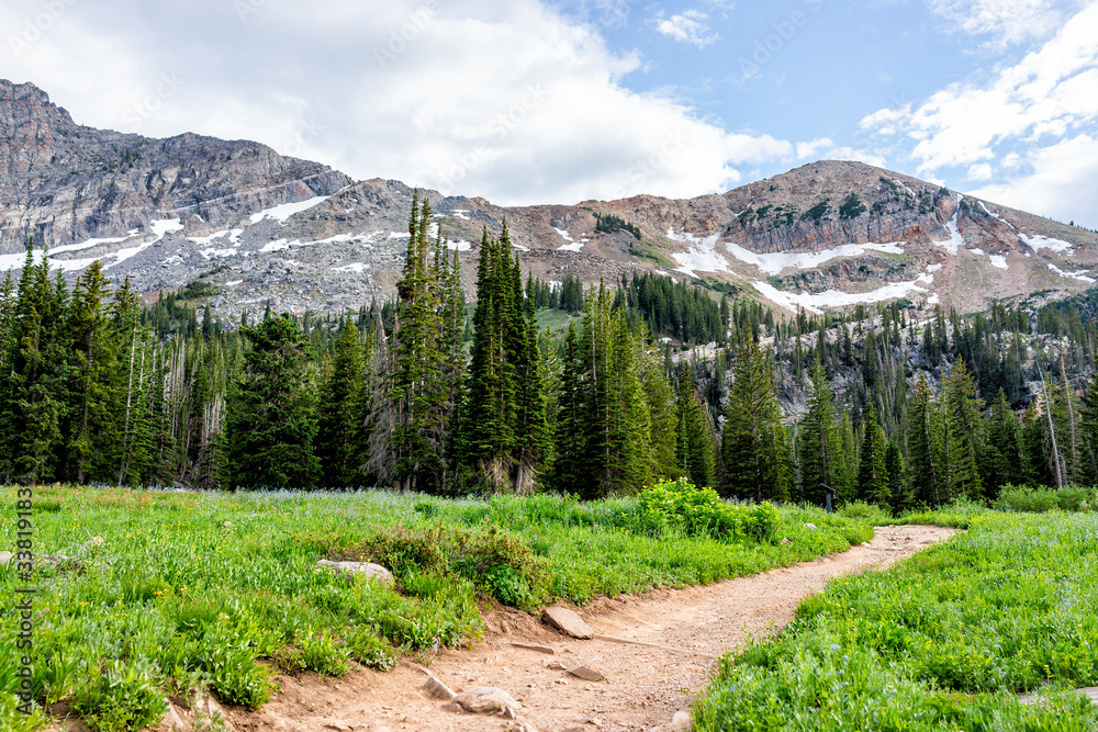 Albion Basin, Utah summer with landscape meadow view of dirt road trail in Wasatch mountains to Cecret Lake