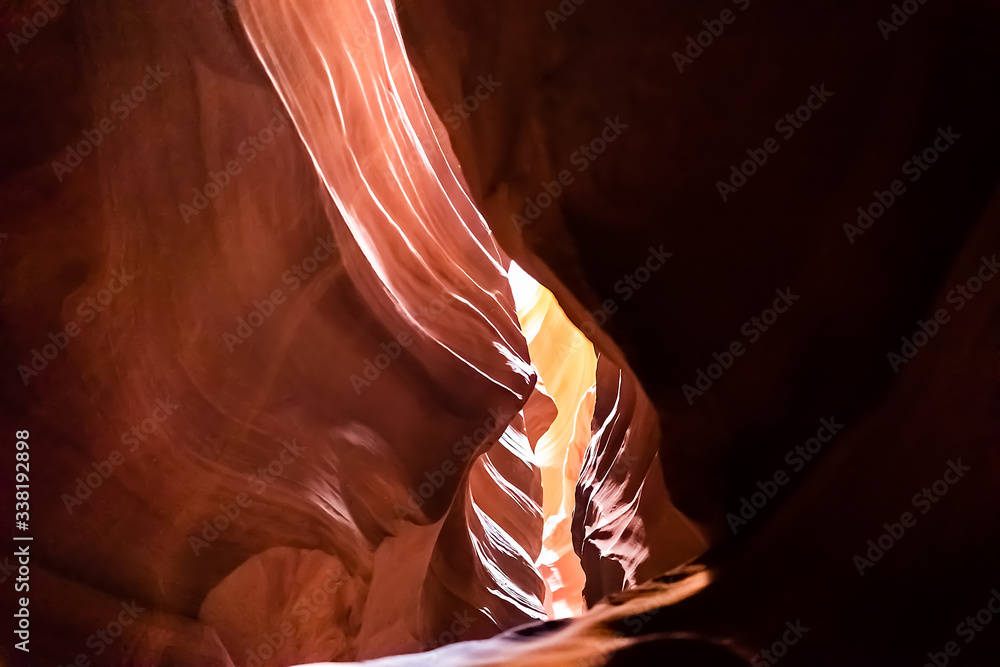 Low angle view of light shadows contrast at Antelope slot canyon with red orange rock sandstone in Page, Arizona