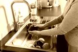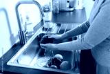 hygiene, health care and safety concept - close up of woman washing fruits and vegetables in kitchen at home
