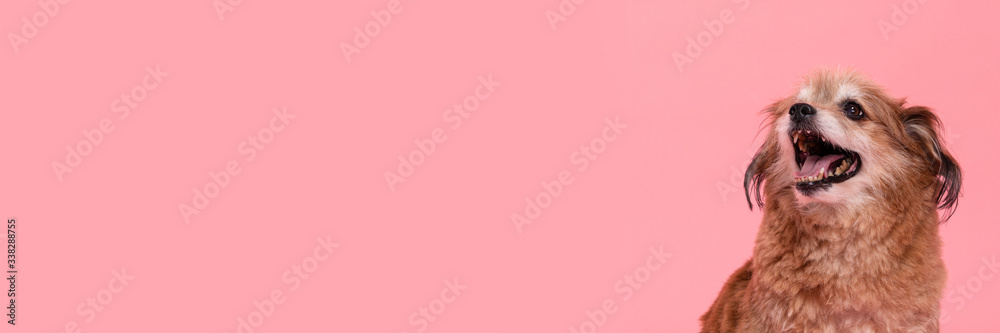 Banner of Mix breed happy dog smile and cheerful on pink background,Happiness dog Concept