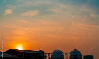 Industrial gas storage tank. LNG or liquefied natural gas storage tank. Spherical gas tank in petroleum refinery. Above-ground storage tank. Natural gas storage industry and global market consumption