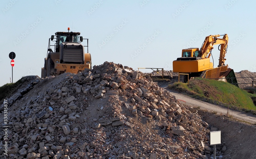 Bulldozer and excavator at work in a building stone material disposal and recycling center