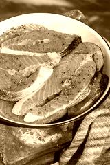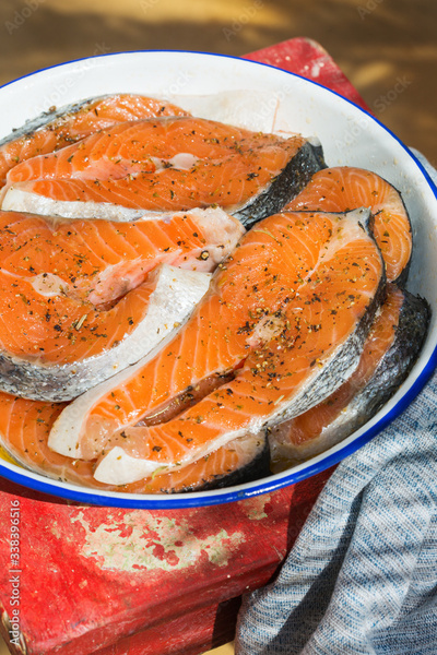 Raw fish salmon steaks prepared for cooking, grilling outdoor