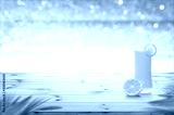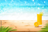 Beautiful Summer background woodent table top and blur sea sandy beach view with green plam leaves as frame