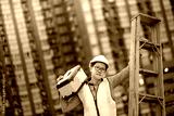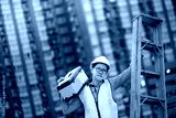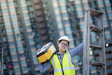 Asian maintenance worker man with safety helmet and green vest carrying aluminium step ladder and tool box at construction site. Civil engineering, Architecture builder and building service concepts