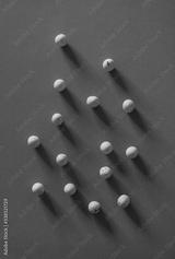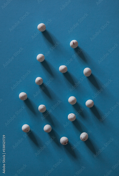 Beliebig verstreute Eier aus vielen Wachteleiern vor blauem Hintergrund. Random placed eggs of many quail eggs on blue background.