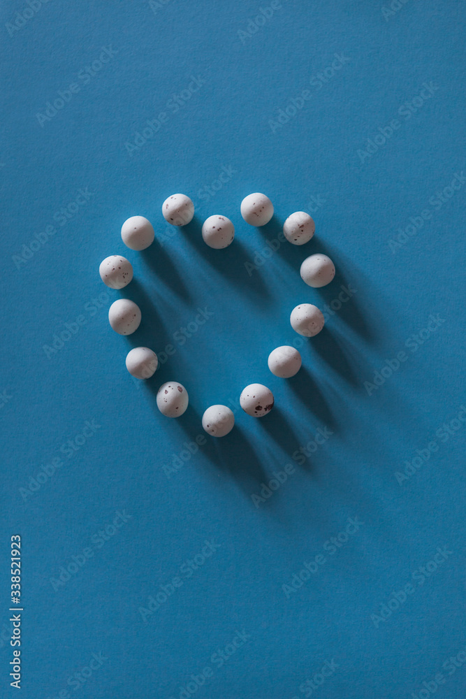 Herz Symbol aus vielen Wachteleiern vor blauem Hintergrund. Heart icon with many quail eggs on blue background.