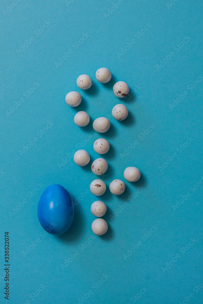Osterei mit Blumen Symbol aus vielen Wachteleiern vor blauem Hintergrund. Easter egg with flower figure with many quail eggs on blue background.