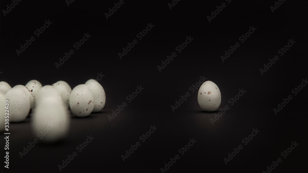 Einsames Wachtelei getrennt von Gruppe vor schwarzem Hintergrund. Lonely quail egg separated from group on black background.