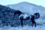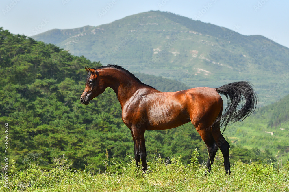 Bay purebred show type arabian stallion with long curved swan like neck in freedom in China's mountains.