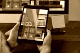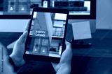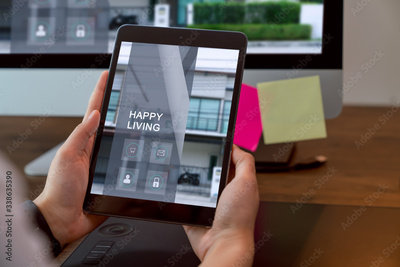 Hand holding digital tablet and using computer with showing website for rent and sale of houses online.
