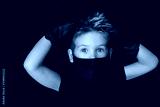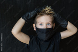 Blond boy in black medical mask against coronavirus.Boy in black mask on a black isolated background.