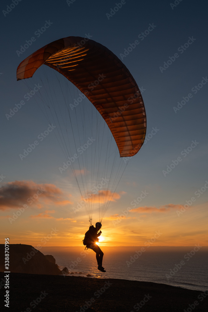 Paraglider flying over thesea shore at sunset. Paragliding sport concept.