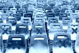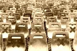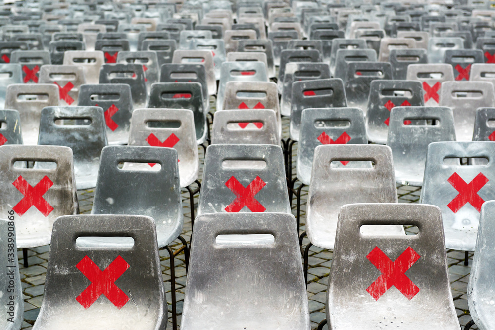 Social distancing concept, warning signs on seats due to coronavirus. Keep safety distance in public place to protect from COVID-19 disease.