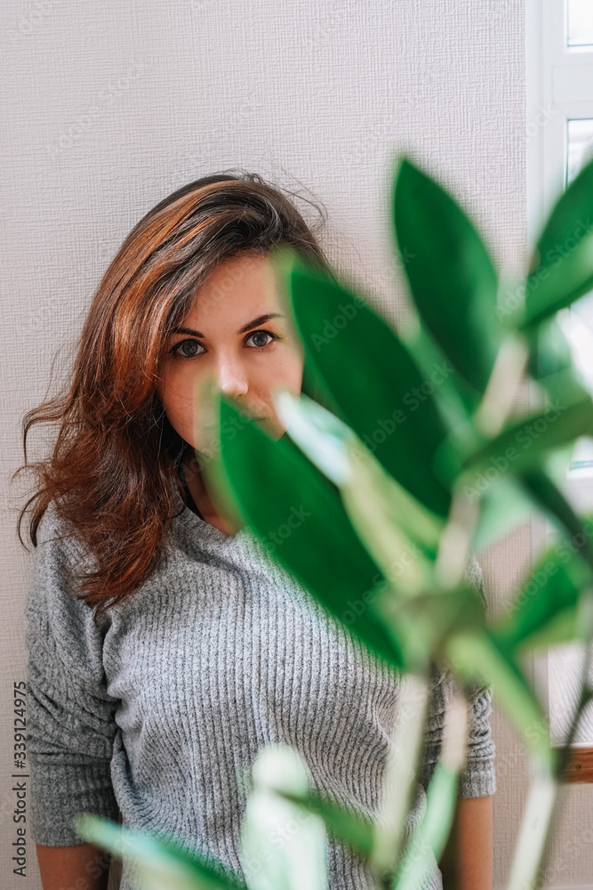 A brunette girl with long hair in a home sweater is sitting against an empty background wall, with leaves of a home plant in the foreground