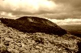 Carpathians mountain hills, covered rocks and grassy slope with forest and mountain range. beautiful summer landscape. Gorgany ridge, Ukraine