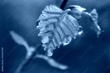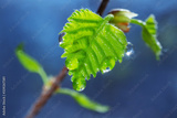 Freshly blossomed leaf of a tree with drops of water close-up. Blue background, beautiful lights and bokeh. Spring minimalism, copyspace. Detailed macro photo. World Environment Day concept.