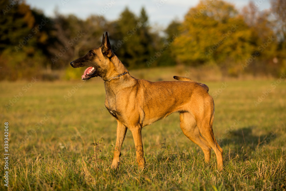 brown dog Belgian Malinois with tongue out standing in high grass by sunset