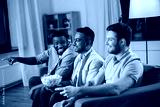 friendship, leisure and people concept - happy male friends with popcorn watching tv at home at night