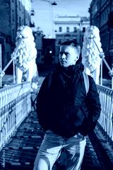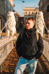 A young blond man in a jacket and with a backpack stands on the bridge with statues of white lions in the middle of the canals of St. Petersburg, Attractions, morning spring