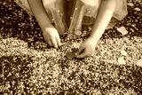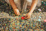 Close up of multi-colored rice cover the ground after a wedding ceremony. Hands of girl hold red heart.