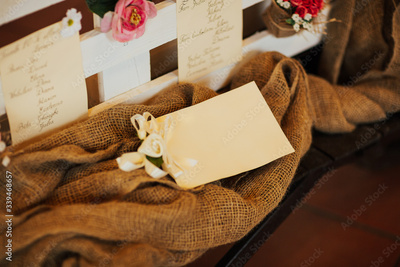 Beautiful white card, envelope, invitation for guests to a wedding with a ribbon and flowers on a wooden background. Photography, concept. Wedding decor. Copy space.