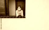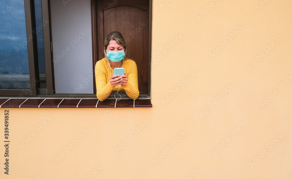 Girl using phone app wearing protective mask at home's window - Young woman during isolation quarantine for Covid 19 prevention - Health and coronavirus concept - Focus on face