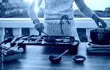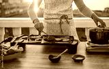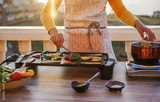 Young woman grill vegetables while preparing dinner in patio terrace outdoor during isolation quarantine - Food, healthy lifestyle and vegetarian concept - Focus on left hand