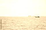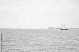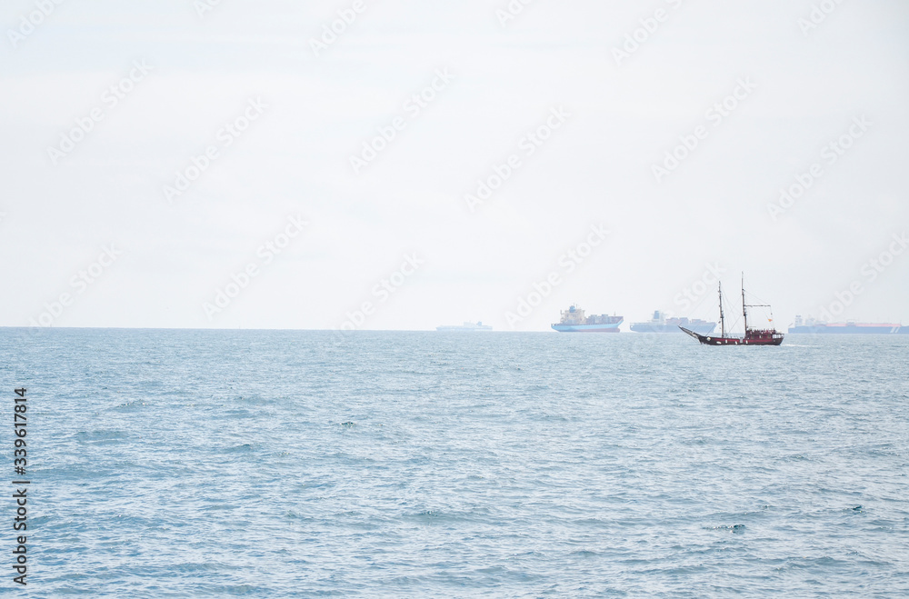 Vintage pleasure boat sailing in the Mediterranean Sea near Barcelona. Cargo ships and tankers on the background. Logistics and transportation concept