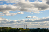 Two Cogeneration plant (combined heat and power station) pipes are painted white and red the color against a natural landscape and a beautiful cloudy sky. Nature and industry