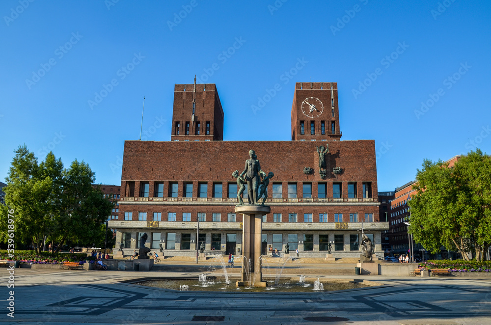 Fountain and bronze statue with women and children in the front of Oslo City Hall (Radhus) - houses the city council, city administration, and art studios and galleries.