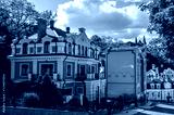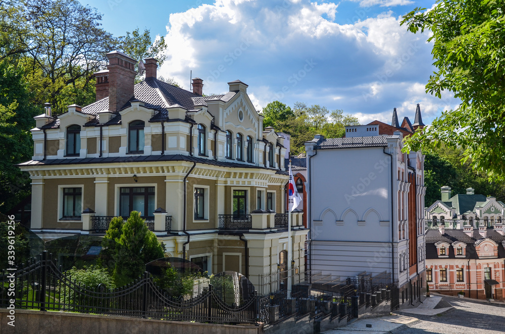 Vozdvizhenska elitte district and Honcharna street. Beautiful Colorful house in the historic part Podol, Kiev Ukraine