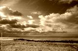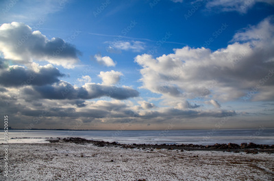 View of snow-covered sandy beach near the frozen Gulf of Finland. Bright cloudy winter day on the outskirts of St. Petersburg