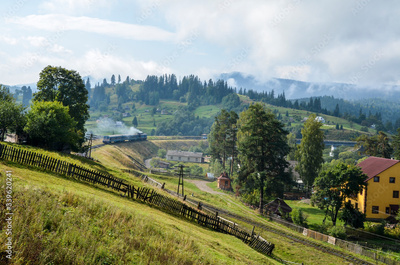 Train in the Carpathians Mountains village Vorokhta. Rural view of mountains and houses at sunny morning. Ukraine