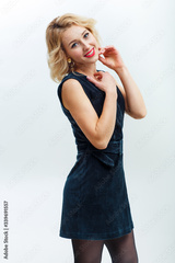 cheerful young blond woman in a dark blue dress looking at the camera on a white background