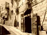 rural scene with old wooden door in a stone wall with brown shutters with colorful washing