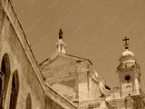 The Church of Saint Catherine in Bethlehem on a sunny day with cross and golden statue, West Jordan Land, Near East