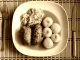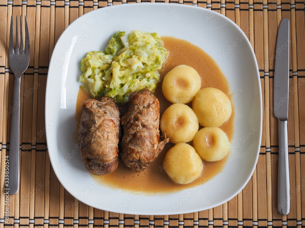Silesian dumplings with pork roulade and cabbage in roast sauce