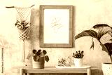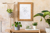 Stylish scandinavian interior of living room with mock up poster frame, wooden console, plants, candels, books, decoration, grunge wall and elegant personal accessories in modern home decor.