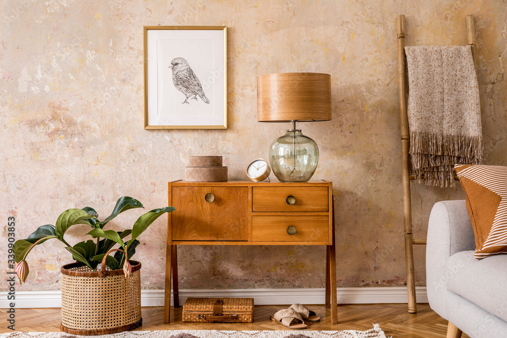 Modern retro composition of living room with wooden vintage commode, furniture, lamp, plant, carpet, pillows, gold mock up poster frame, plants, decoration and personal accessories.