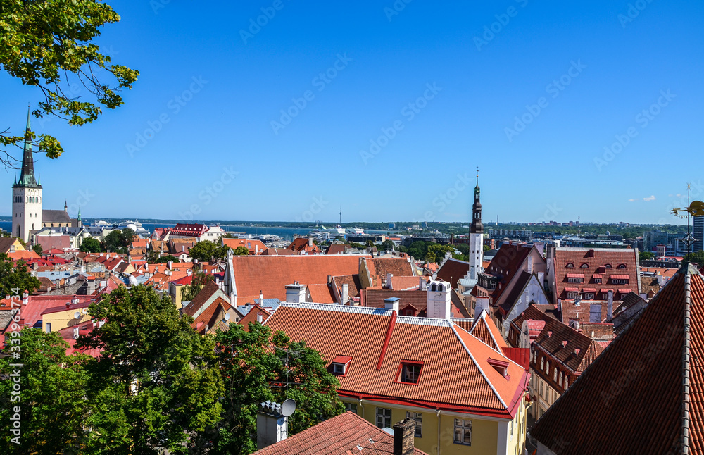 View of medieval old town with tiled red roofs, St. Olaf Baptist Church and Church of the Holy Spirit on a sunny summer day. Tallinn, Estonia