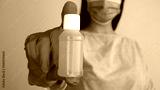 A woman with a face mask holds a plastic bottle of hand alcohol gel.