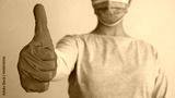 A nurse with a surgical mask and blue rubber gloves gives thumbs up.