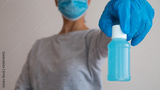 A woman with a surgical mask holds a plastic bottle of alcohol gel in her hand that is in a rubber glove