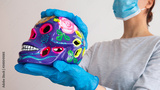 Caucasian woman with a surgical mask and rubber gloves holds a decorative human skull.