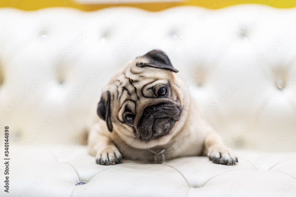Cute pug lying on sofa smile and happiness with positive emotional,Healthcare Purebred Dog Concept