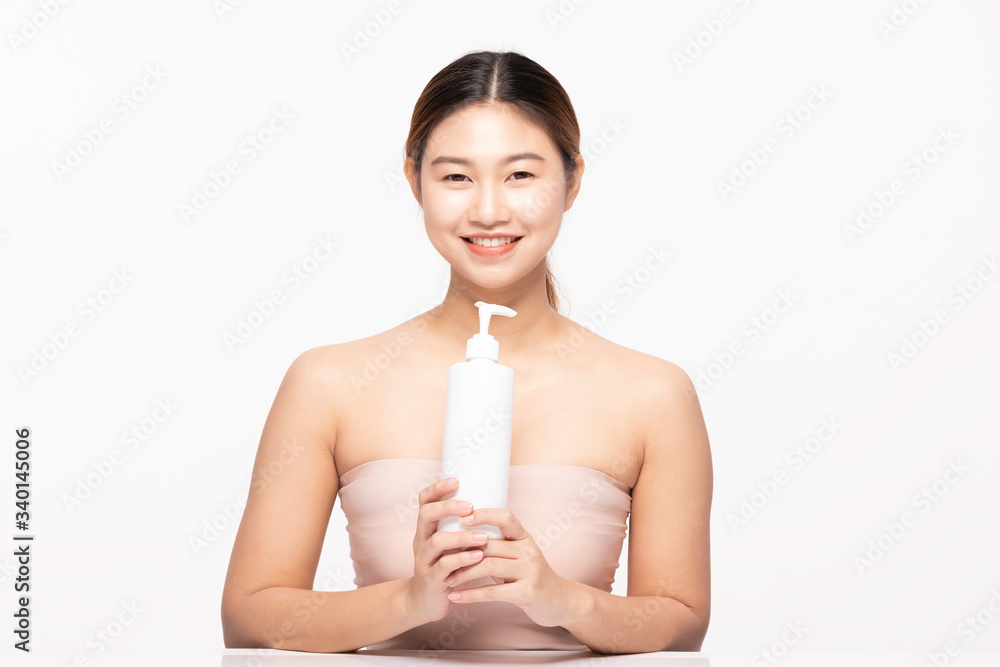 Attractive Asian young woman smile with white teeth holding white Lotion bottle feeling so happy and cheerful with healthy Clean and Fresh skin,isolated on white background,Beauty Cosmetology Concept