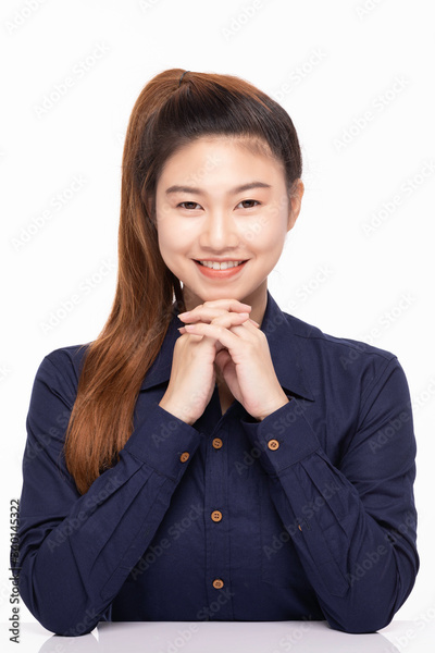 beautiful business Asian woman wearing blue shirt smile with happiness and confident feeling,Isolated on white,Positive emotional