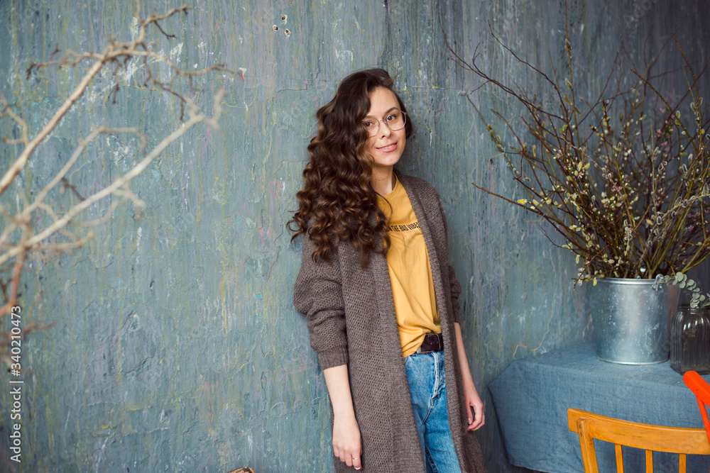 Young attractive woman artist or designer posing in her studio. Lifestyle portrait of happy creative girl in glasses in workplace.