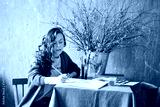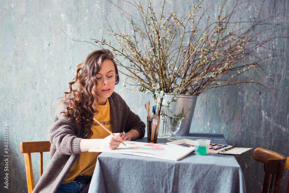 Beautiful girl artist work at watercolor sketch in her studio. Portrait of caucasuan curved hair young woman.